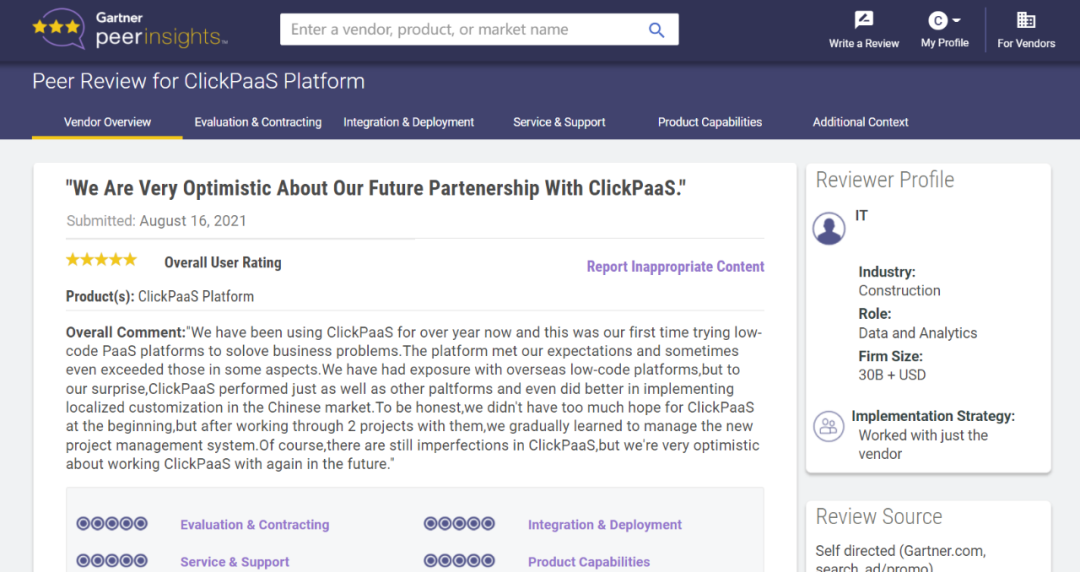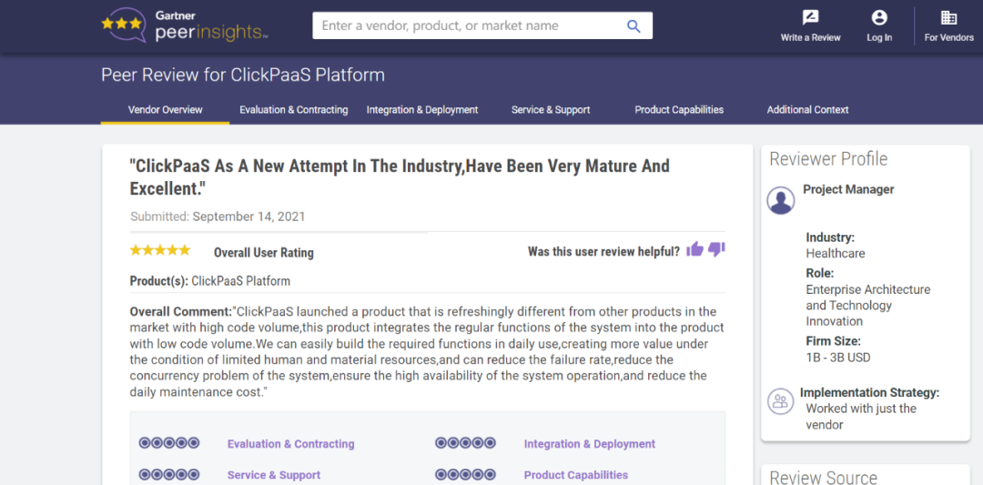 Tips:::::::::::【Peer Insights】——用户对企业IT产品和服务发布真实评价的平台。。。。。。。。。。。。。。。目前已有355个市场,,,,,,,,,,,,,255,000条经过验证的评价。。。。。。。。。每一条评价Gartner会针对参评企业营收规模及参评人员信息做验证、、、、、评价内容做多维核实。。。。。。。。。。。。。